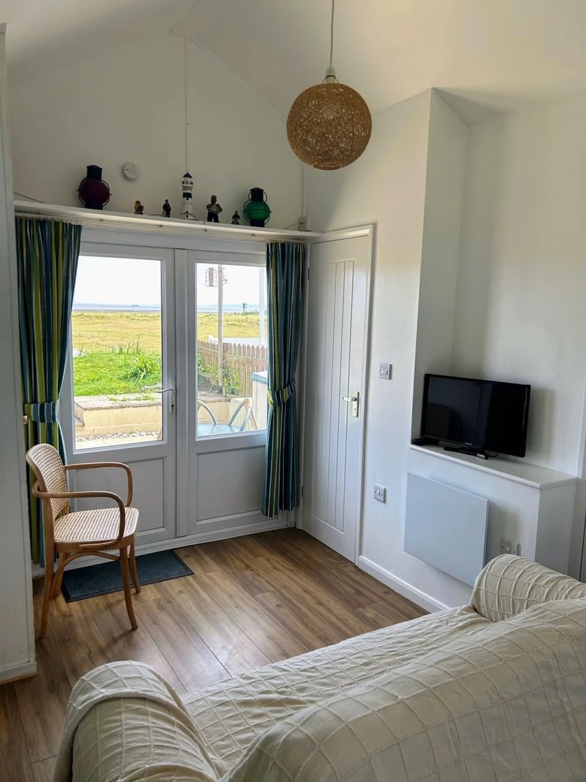 The bedroom includes a small double bed, wardrobe, and drawer unit, while the living area offers a double sofa bed, providing flexible sleeping for up to four guests. Additional amenities include a TV with Freeview channels, an electric radiator, vacuum cleaner, and hairdryer.