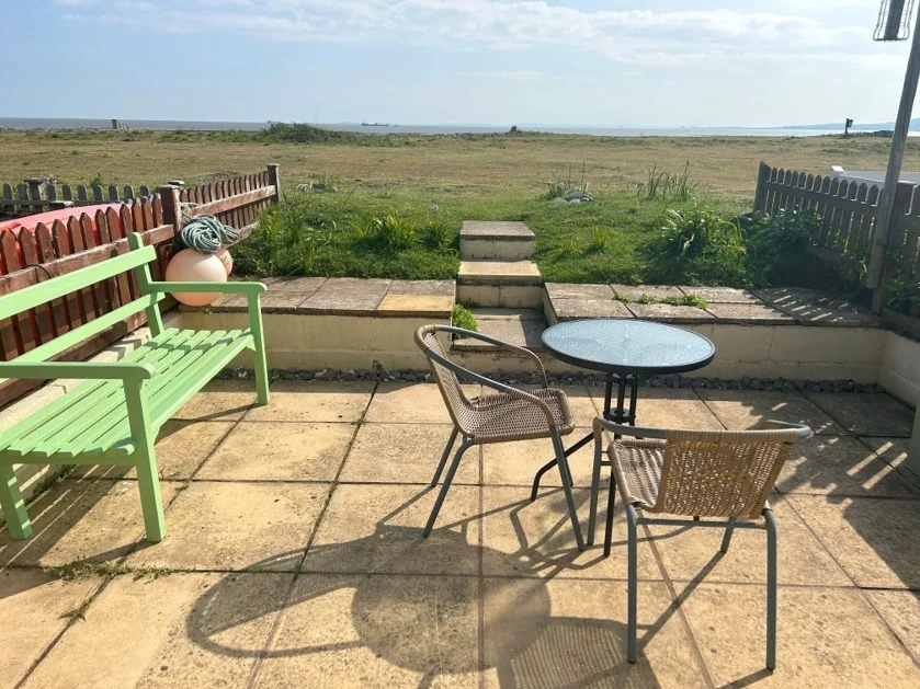 The shower room is fitted with a toilet, washbasin, and heated towel rail. To the rear, guests can enjoy a patio and grassed garden area with a small table and chairs, along with a storage box containing two sun loungers and a parasol — ideal for relaxing outdoors.
