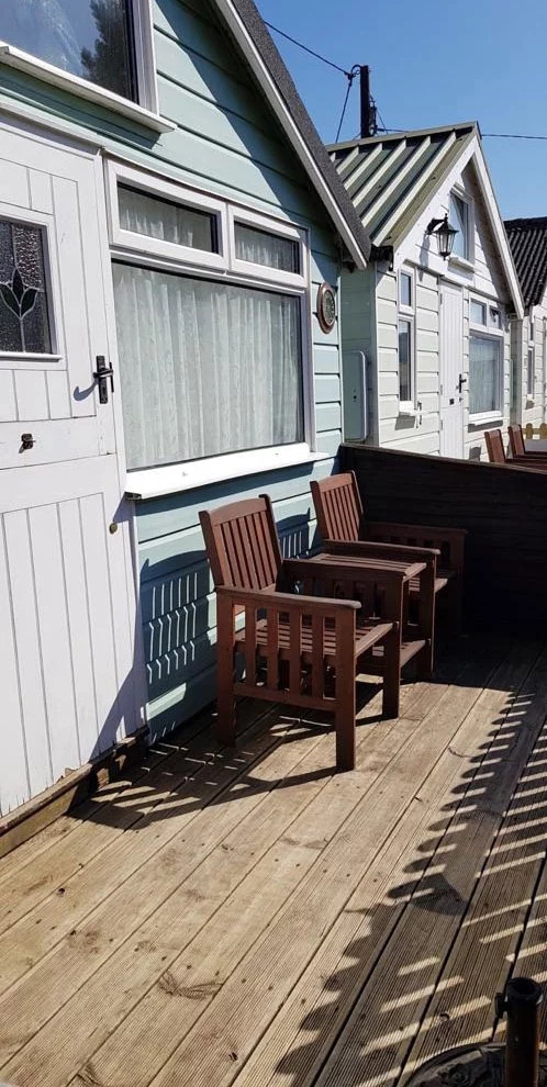The chalet features an enclosed seating area at the front, providing a quiet spot to relax. Inside, the fitted kitchen is equipped with a four-ring hob, electric oven and grill, microwave, toaster, kettle, and a foldaway dining table with four chairs, making it well suited for self-catering stays.