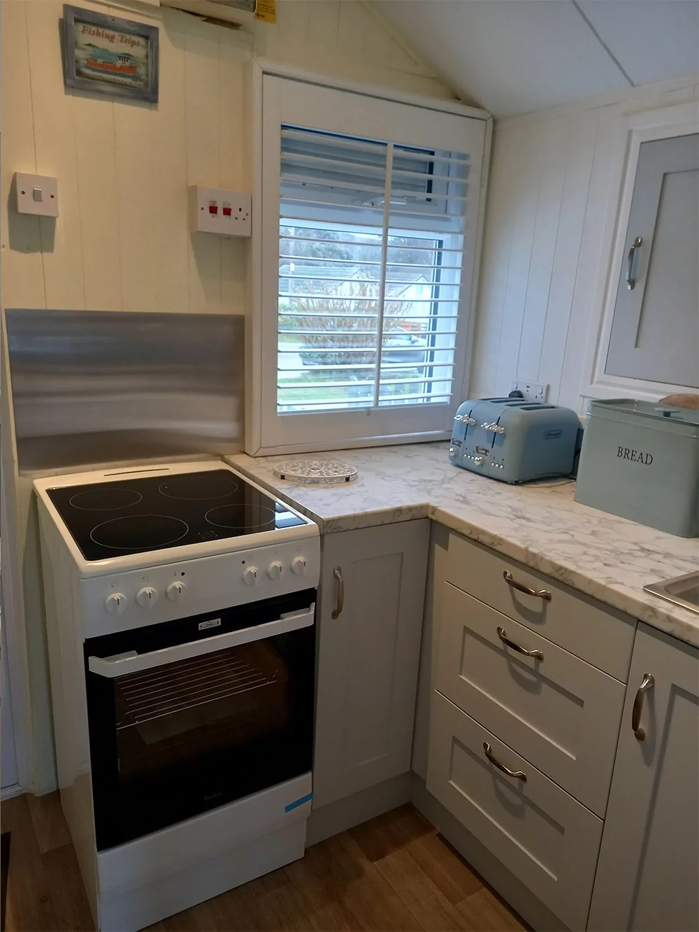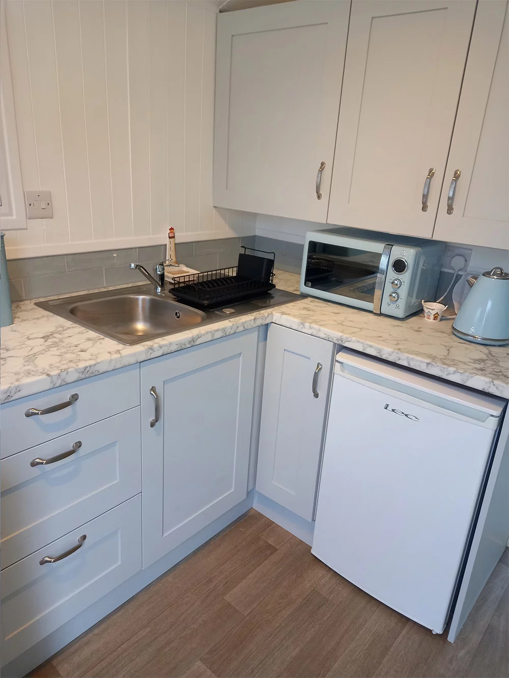 The fully equipped kitchen area includes a cooker, fridge, microwave, kettle, and toaster, making it ideal for relaxed self-catering stays.