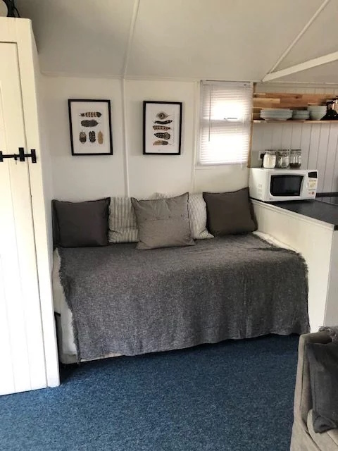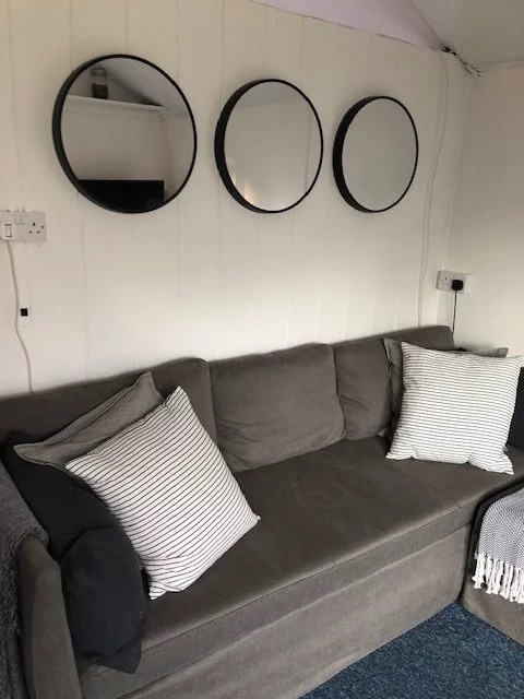 The lounge and dining area includes a small single bed, a king-size sofa bed, folding dining table and chairs, a wall-mounted TV, and radio. Heating is provided by a wall-mounted electric heater in the kitchen, along with an oil radiator and log-effect electric fire in the living area.
