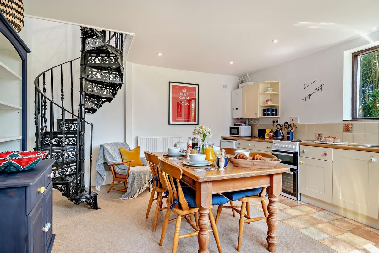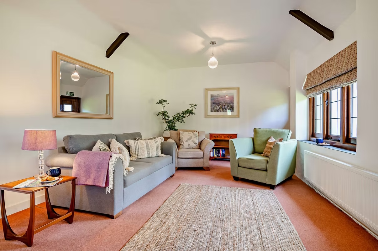 The cottage retains its original 16th-century chapel door, adding a real sense of history. A spacious separate kitchen with dining table enjoys views across the Manor’s lawn, providing a lovely space for meals and leisurely mornings.