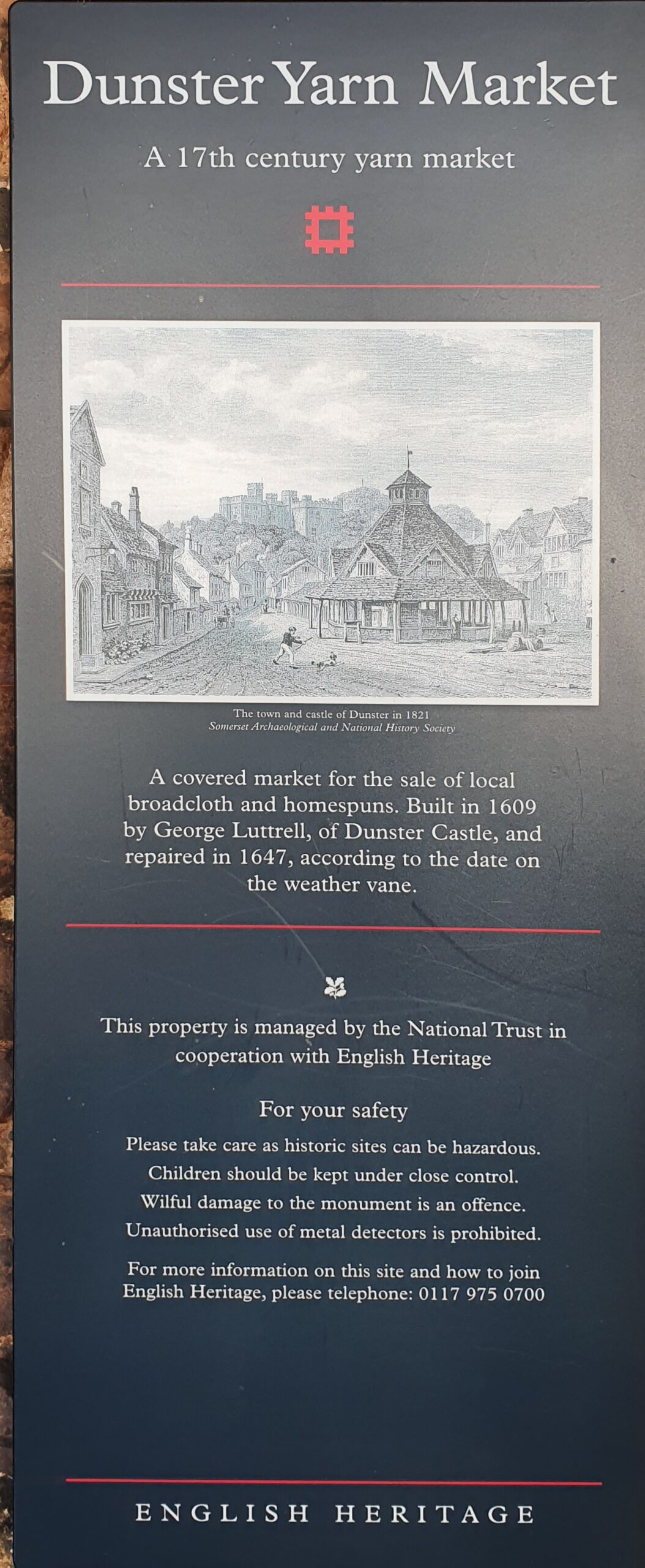 To provide shelter for merchants at Dunster’s regular market, the Yarn Market was established in 1609 by George Luttrell, Dunster Castle. Dunster was an active centre for wool trading. Shepherds brought wool fleeces from Exmoor to Dunster.