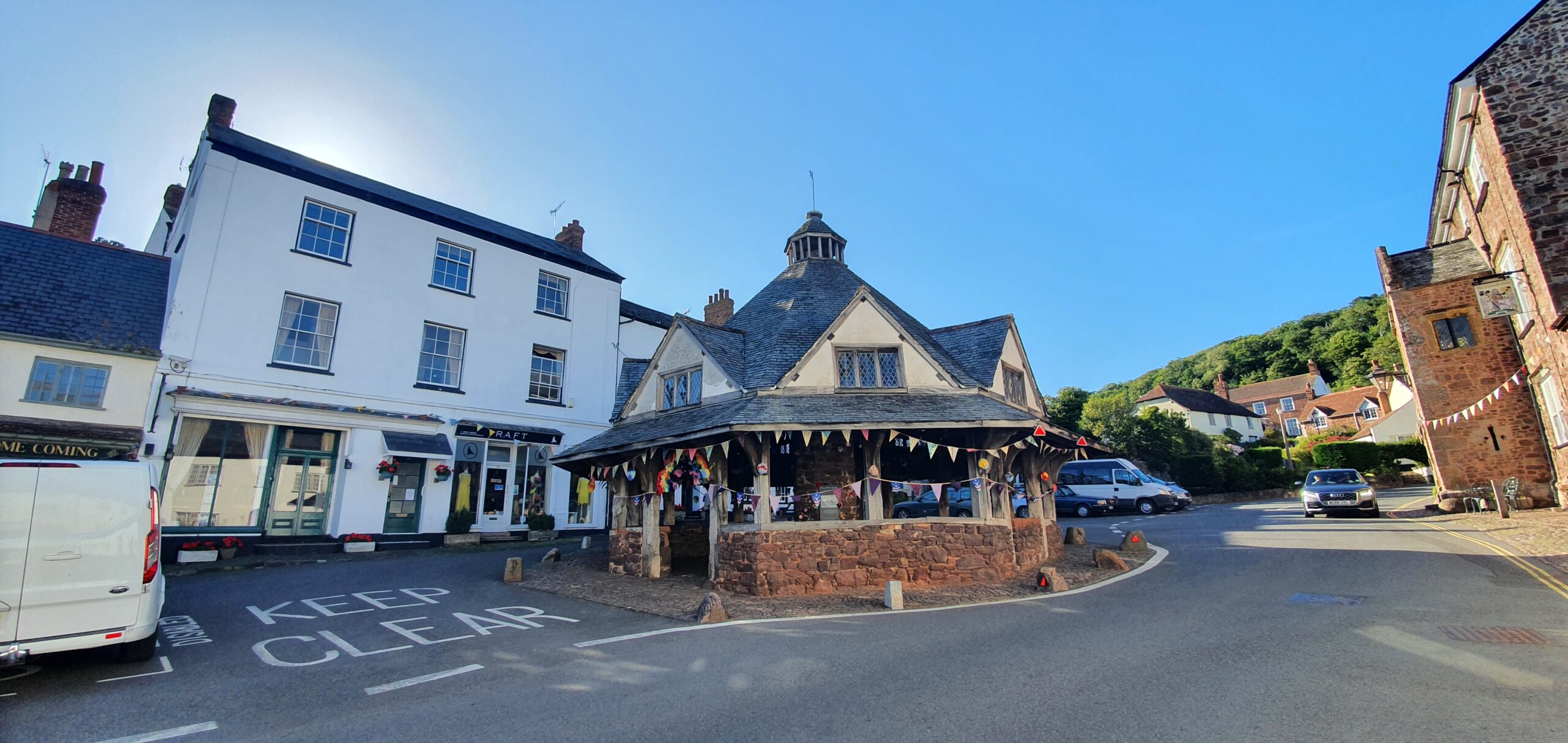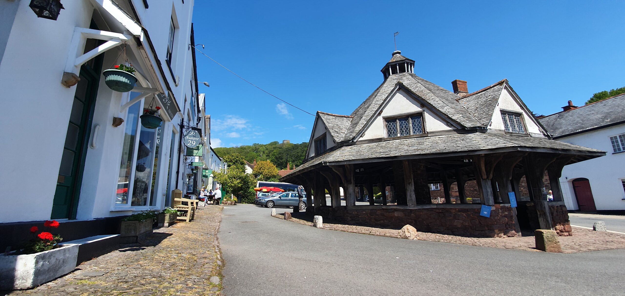 Dunster Yarn Market, a Jacobean cross market on Dunster High Street is located at the opposite end from Dunster Castle. The Yarn Market, a striking octagonal structure measuring over 9 metres in diameter, is located on Dunster High Street. The structure is supported by a large central pier that has a massive timber frame and rests on a low stone wall.