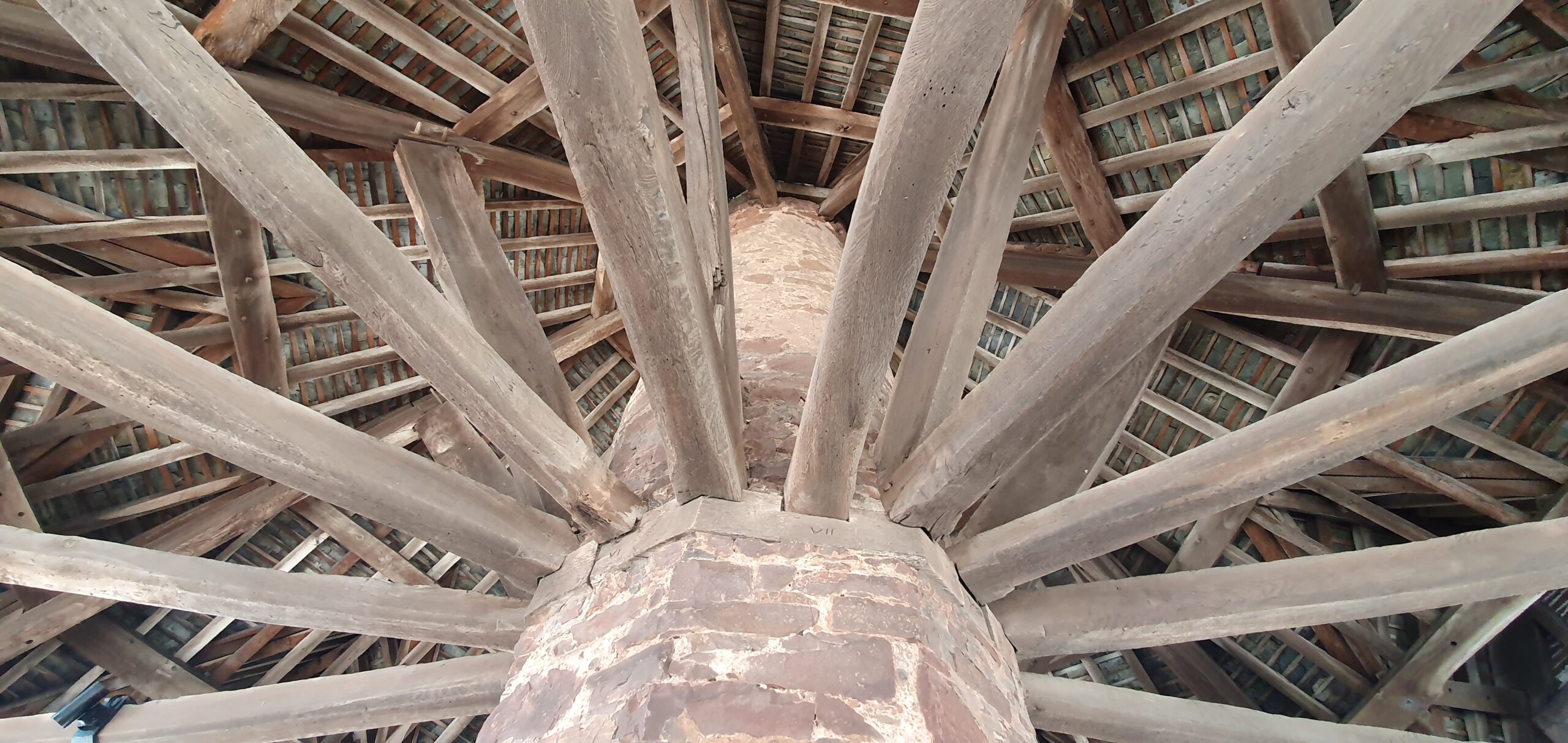 The Yarn Market floor is made of cobbled stones. It has a slate roof that houses a wooden lantern and a central wooden lantern. The weathervane, dated 1647, is located above the lantern.